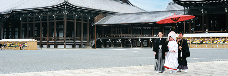 ・7:00 お支度開始 ・10:00 ホテルご出発 ・10:30 リハーサル ・11:00 挙式 ・11:45 集合写真 ・12:10 奉告参拝 ・12:45 西本願寺ご出発 ・13:30 ご会食・ご披露宴など |